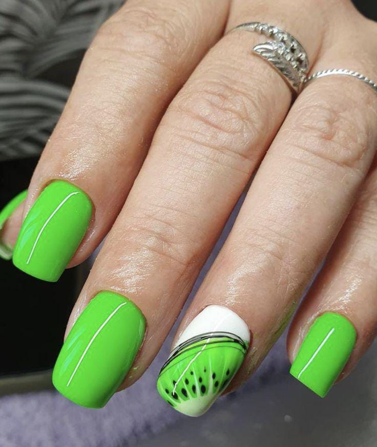 Bright green nails with a glossy finish are paired with a playful kiwi slice and line art accent for a juicy, summer-ready look. The design feels cute, fruity, and fun without being overdone.