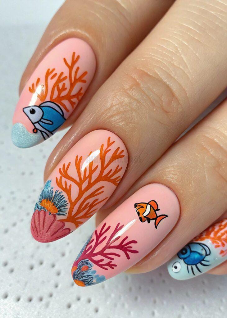 Peachy pink nails feature whimsical underwater details like coral branches and tiny sea creatures. The design feels playful, artsy, and inspired by warm beach summer days.