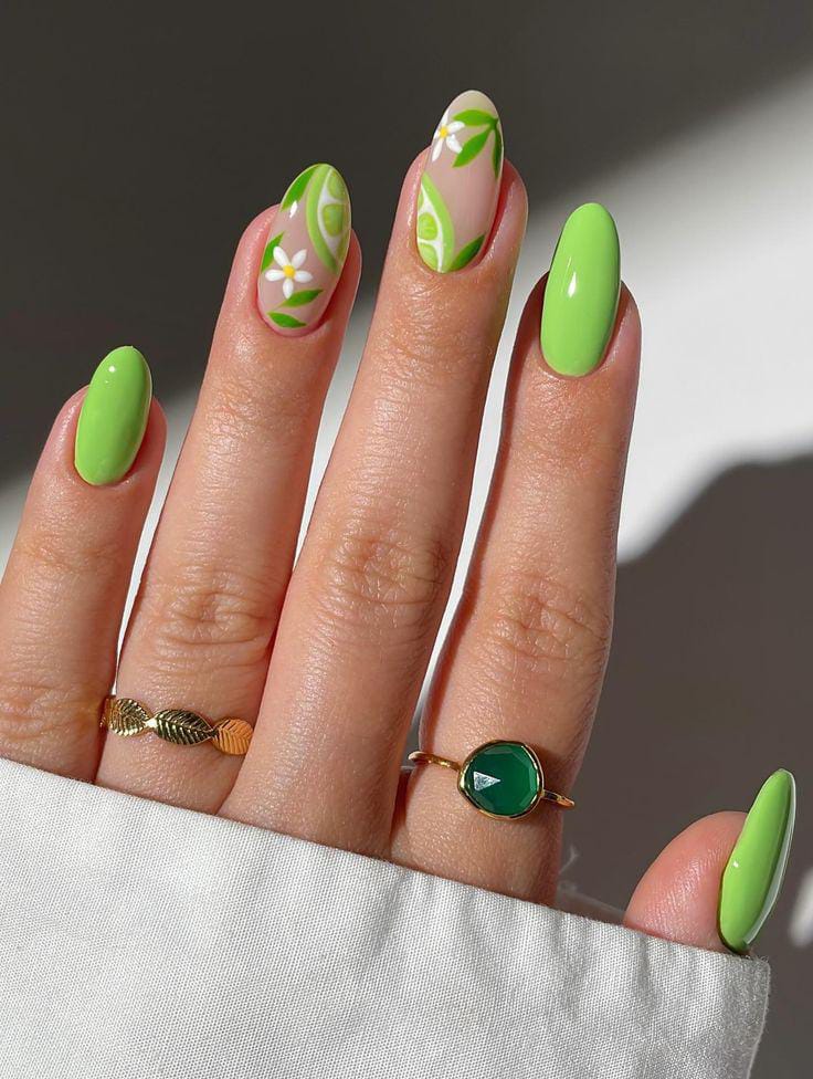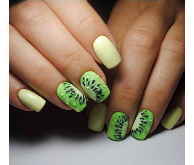 Light green nails with detailed kiwi slice accents create a refreshing and fruity summer aesthetic. The look is vibrant, fun, and perfect for a tropical mood.