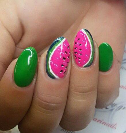 These nails feature bright green and juicy pink tones with playful watermelon slice accents. The look is cute, fun, and instantly screams summer freshness.