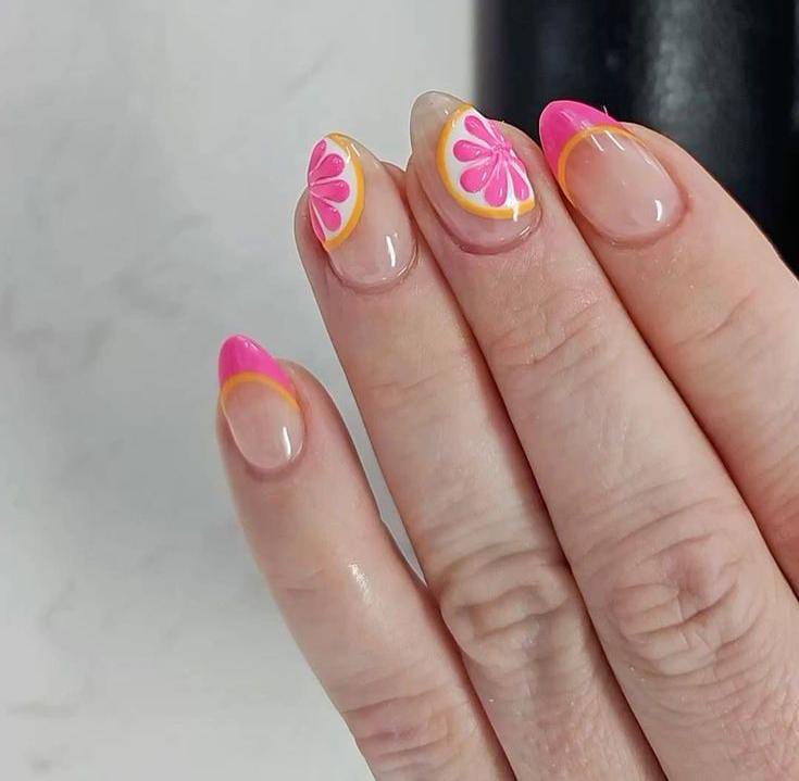 This design mixes soft nude nails with hot pink French tips and playful citrus slice accents. It feels fresh, fun, and perfect for bright summer days.