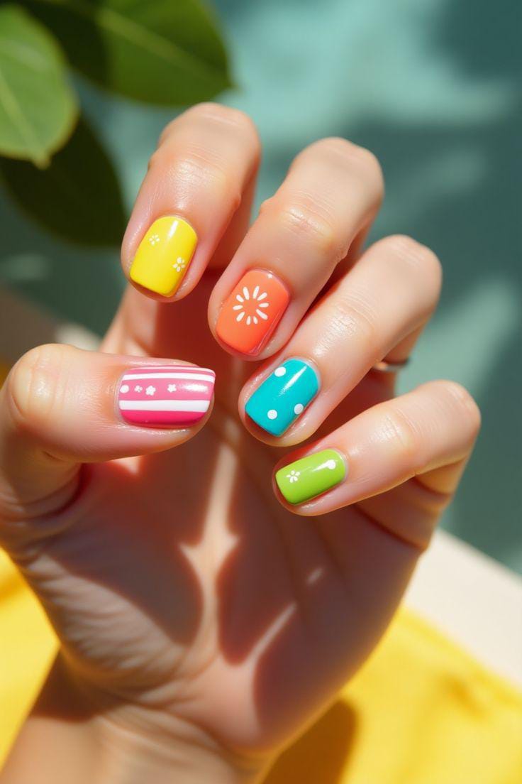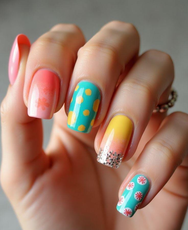 Bright blues, coral and yellow colors with dots, and shimmer tip gradients, and tiny patterns create a lively and cute design. It gives off a fun, carefree summer vibe with a playful twist.