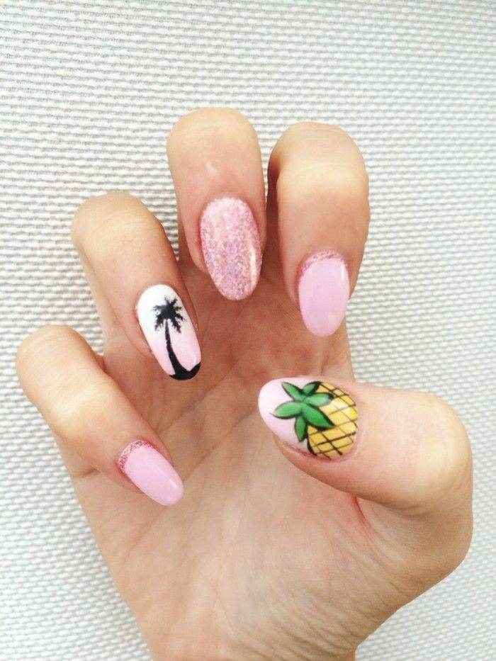 Soft pink nails are mixed with glitter accents and playful pineapple and palm tree art. The overall look feels cute, tropical, and fun summer without being too bold.