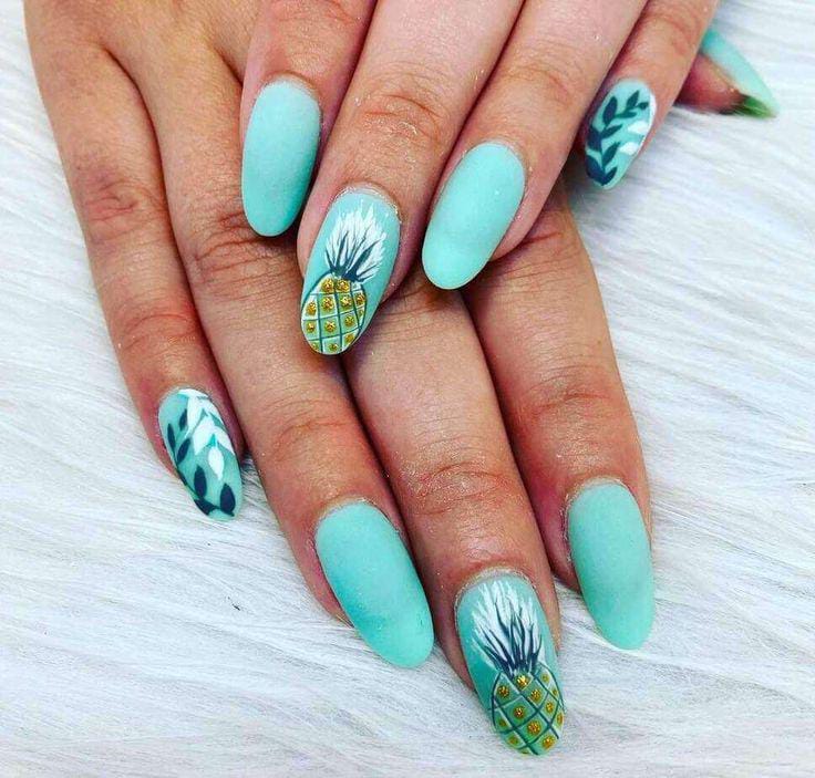 Cool mint nails are paired with delicate pineapple and leafy details for a fresh summer feel. The design is light, trendy, and perfect for a relaxed tropical cute vibe.