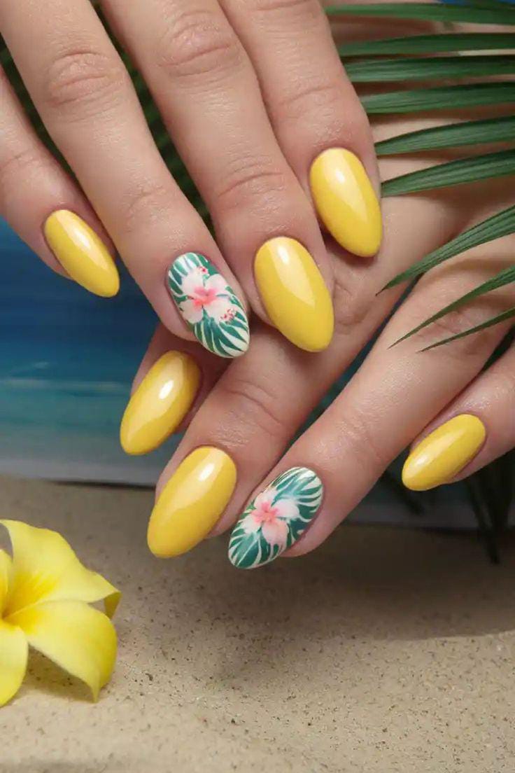 Glossy yellow nails are balanced with soft white accent nails featuring tropical flowers and leaf details. The style is clean, fresh, and effortlessly summery.