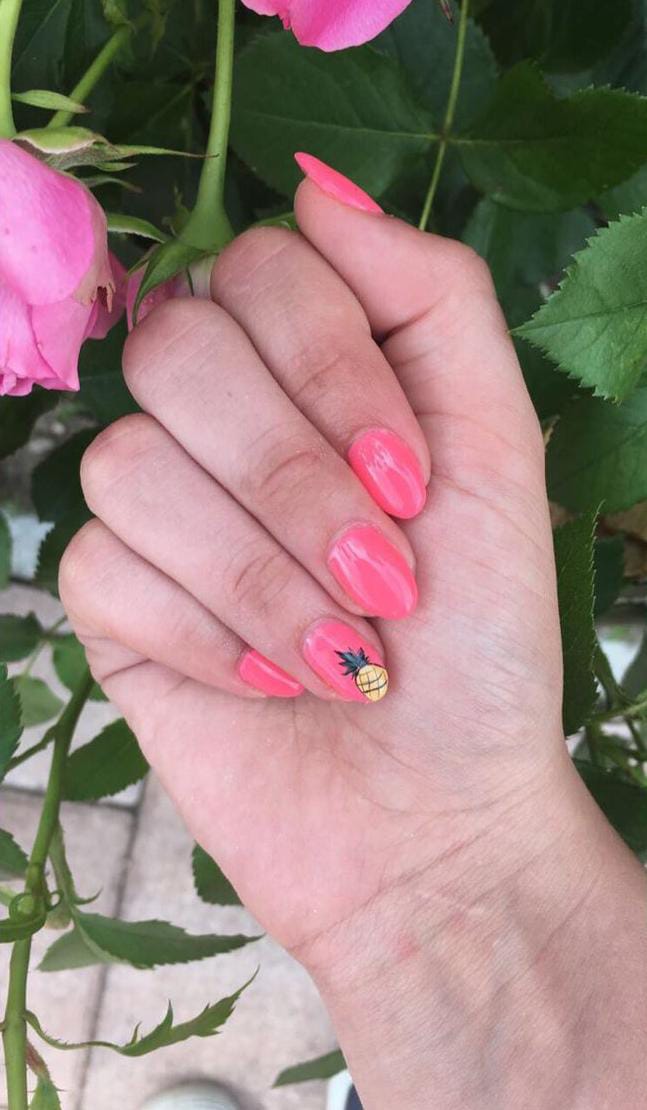 A vibrant, tropical look featuring a bold pink base with a cute pineapple accent, perfect for adding some fun flair to your summer nails.