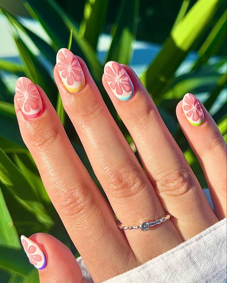 These nude floral tip nails with pastel rainbow swirls, citrus details, and strawberry accents give this design a playful summer vibe. The mix of colors feels bright, fun, and full of cuteness.
