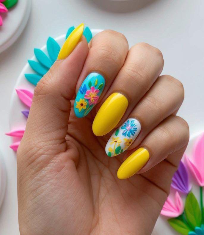 A fresh and colorful design with yellow, blue, and white nails featuring floral accents. This design exudes a fun and carefree tropical cute summer vibe.