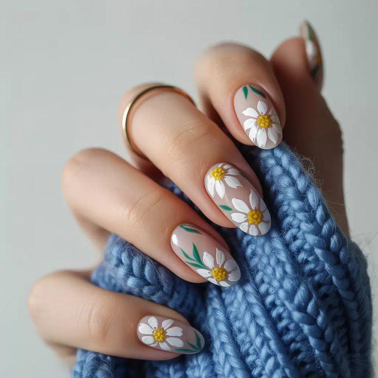 Featuring soft neutral tones with white daisies and green leaves, this design is cute yet elegant, perfect for a light and breezy summer look.