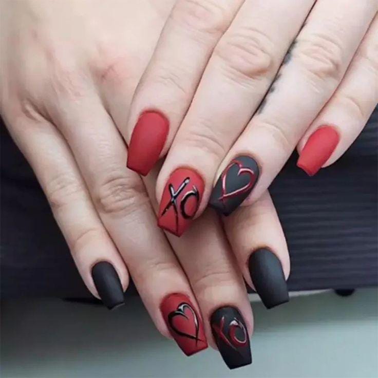 This design mixes matte dark red and black nails with simple heart outlines and “XO” accents. The vibe is bold, edgy, and perfect for a modern Valentine look.