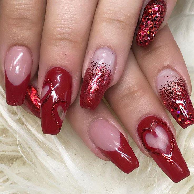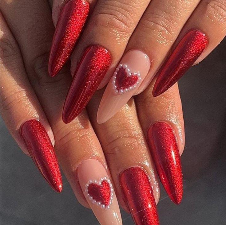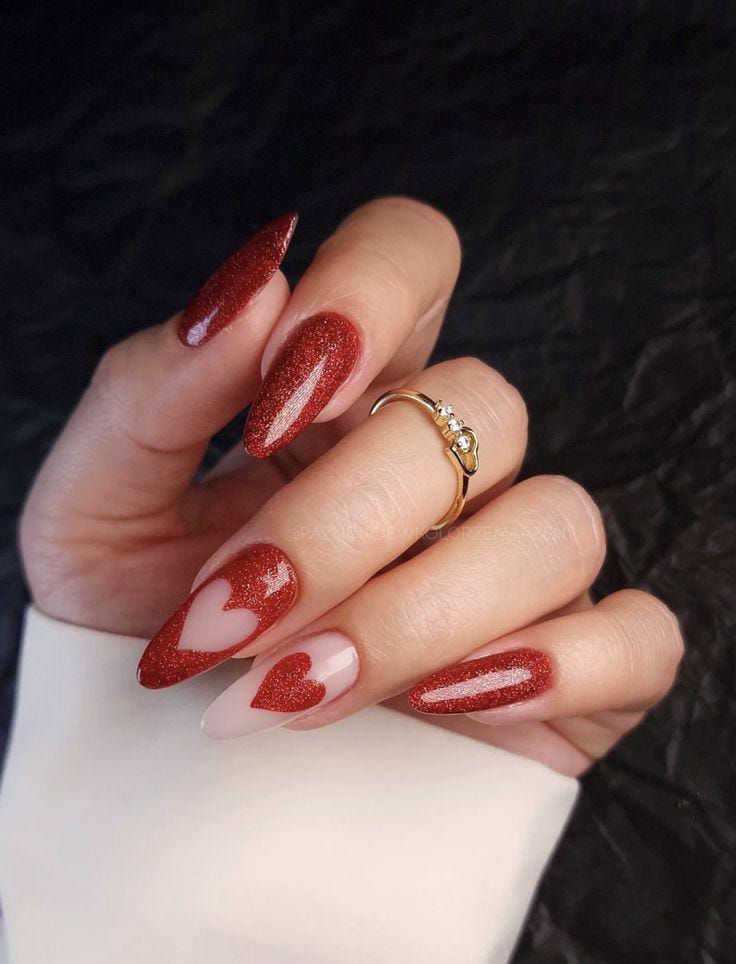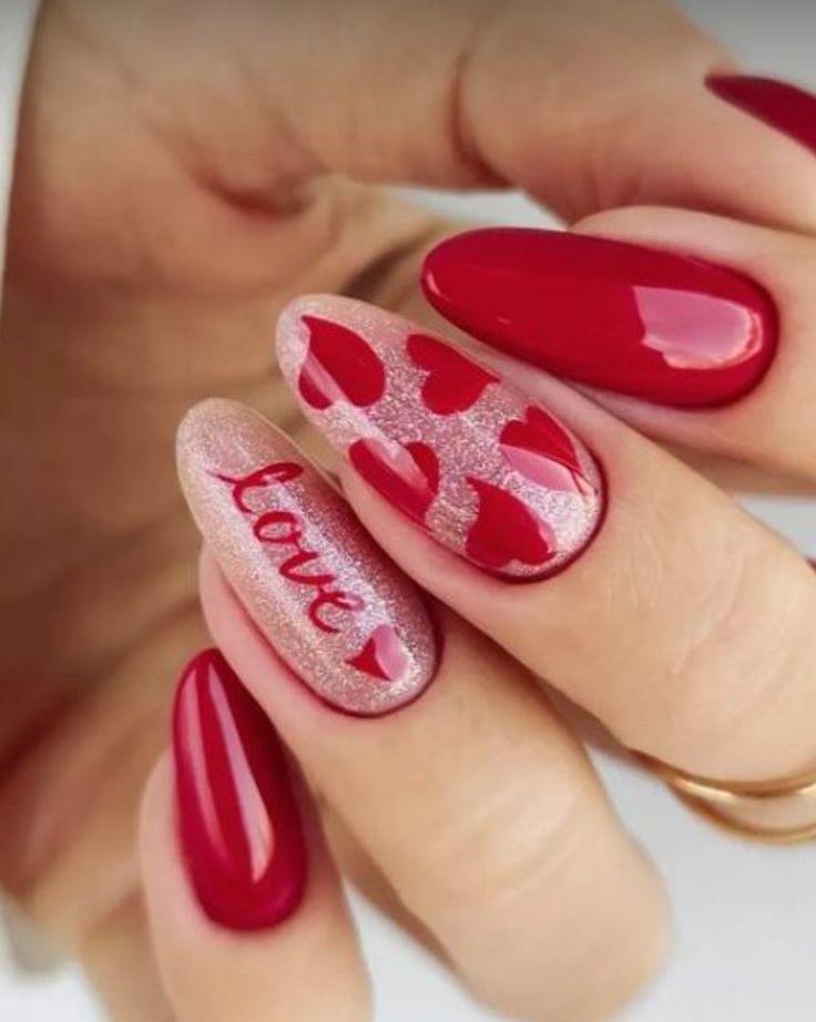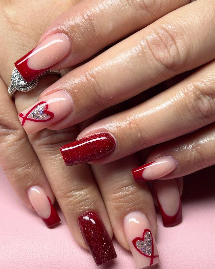 Rich dark red glossy nails are mixed with glitter finishes and a nude accent decorated with small red hearts. It feels glamorous, Valentine’s festive, and bold without being overdone.