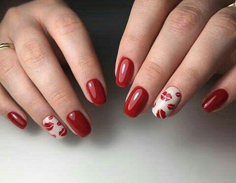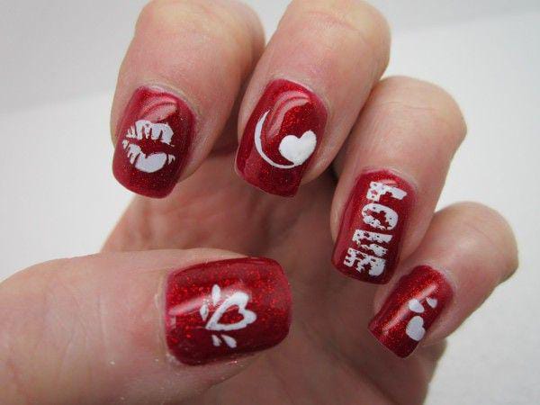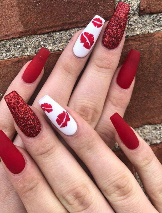 Matte and glittery dark red nails are paired with white accents featuring kiss prints. This look is confident, dramatic, and perfect for a bold Valentine statement.