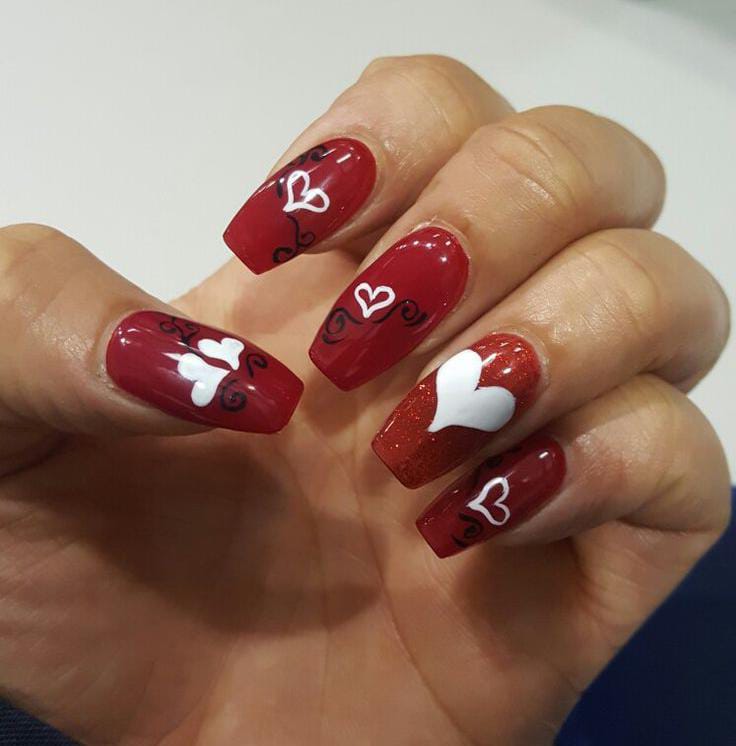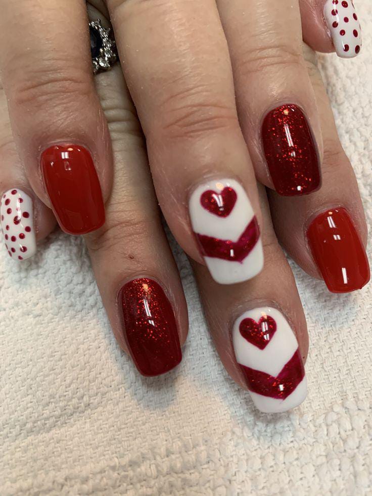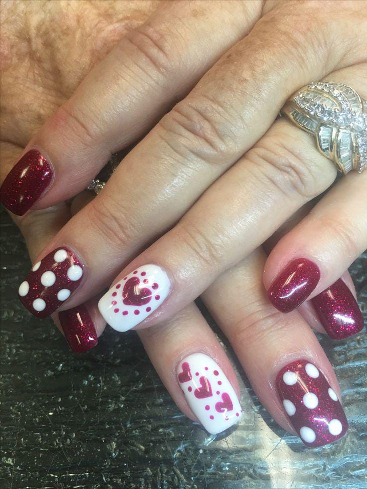 Dark red glitter nails mixed with white accent nails and heart patterns create a festive feel. The design looks sparkly, cheerful, and perfect for a Valentine celebration.