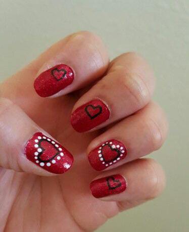 Glittery dark red nails feature simple heart outlines and dotted accents. The design is cute, festive, and full of Valentine sparkle without being overdone.