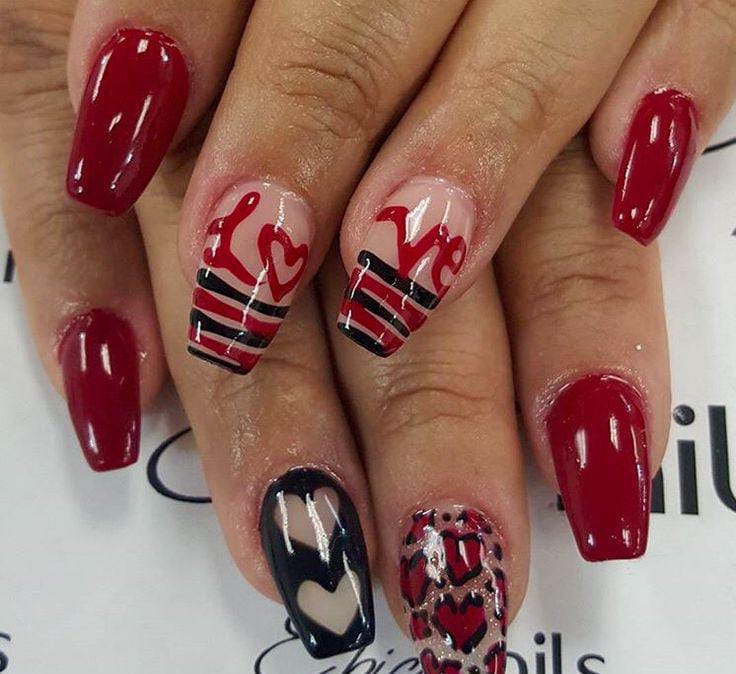 This design blends dark red nails with playful heart accents and graphic patterns. The mix of glossy red, black details, and romantic motifs gives it a bold Valentine vibe.