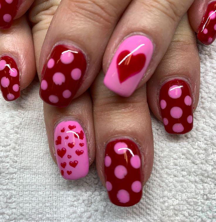 Dark red nails paired with pink polka dots and heart details create a fun, cute look. The overall style feels playful, youthful, and perfect for Valentine’s Day.