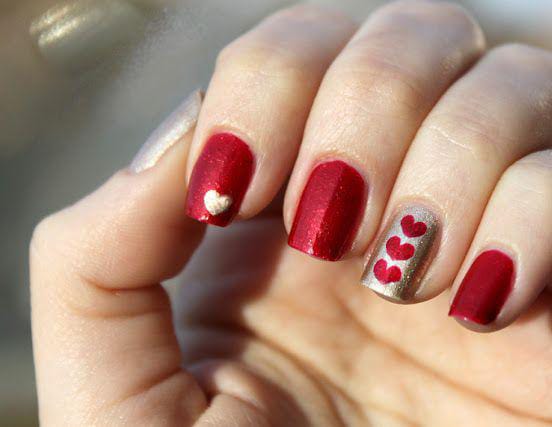 Dark red and blush tones are combined with raised heart embellishments and glossy finishes. The look is luxurious, dramatic, and very Valentine-focused.