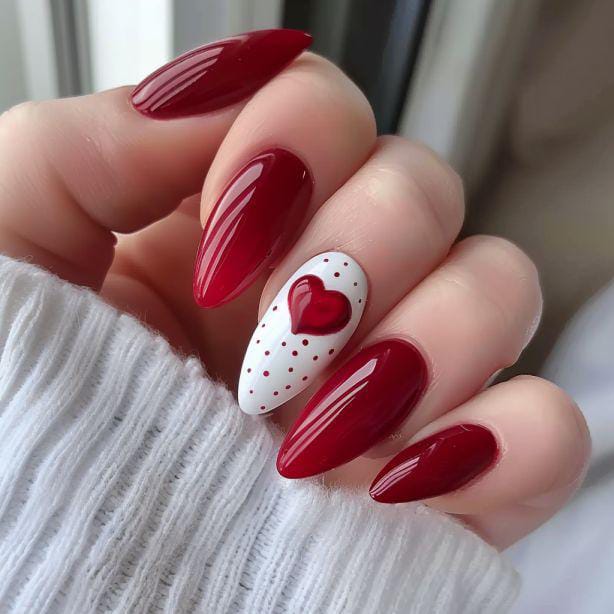 Dark red almond-shaped nails are paired with a white dotted accent nail and a raised heart design. The look is classy, romantic, and slightly modern Valentines.