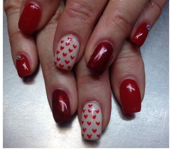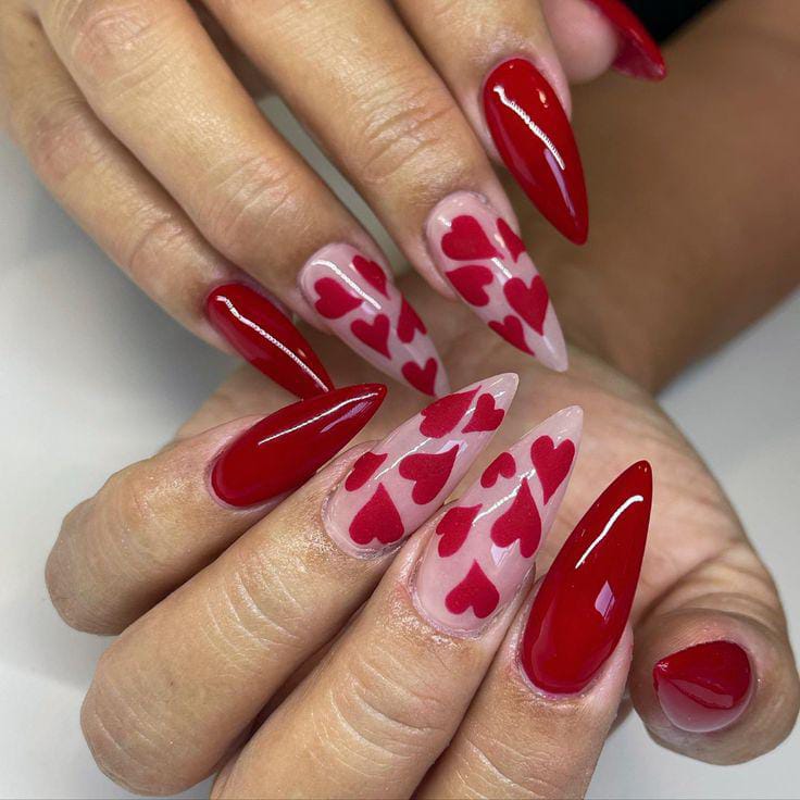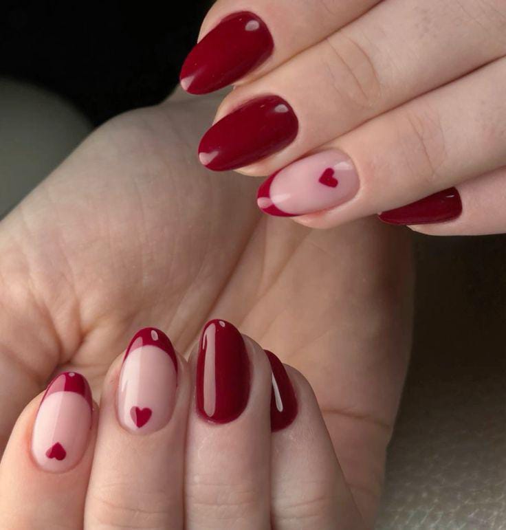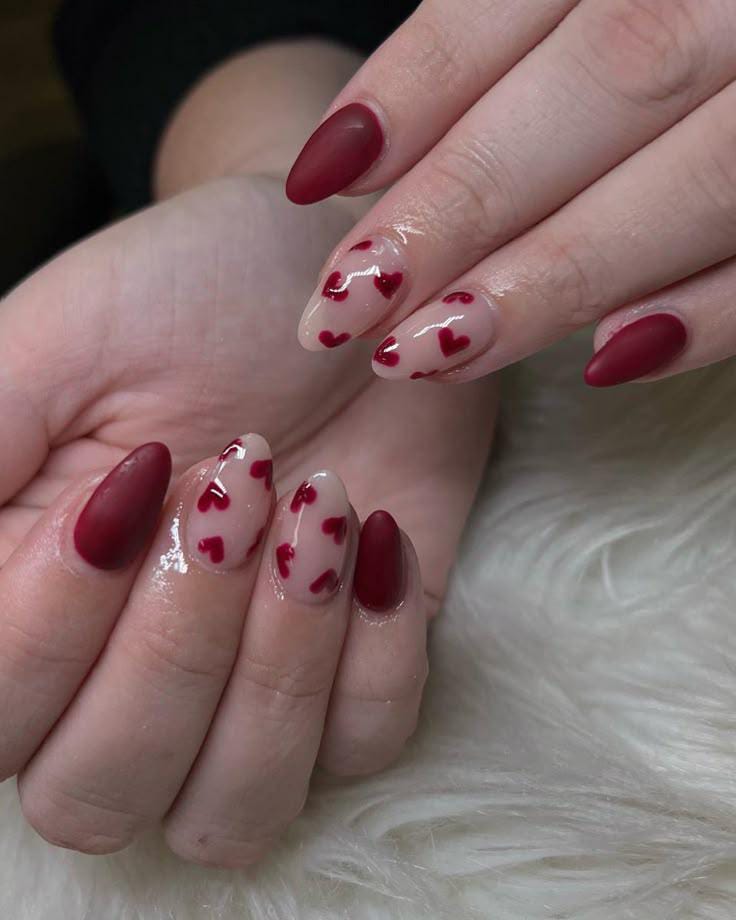 Rich dark red nails are mixed with a sheer nude base covered in tiny red hearts. It feels playful, glossy, and soft while still keeping a classy Valentine mood.