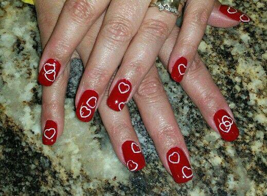 Rich red shades mix with clean white nails featuring heart and chevron patterns. The overall style is balanced, cozy, and very Valentine-focused.