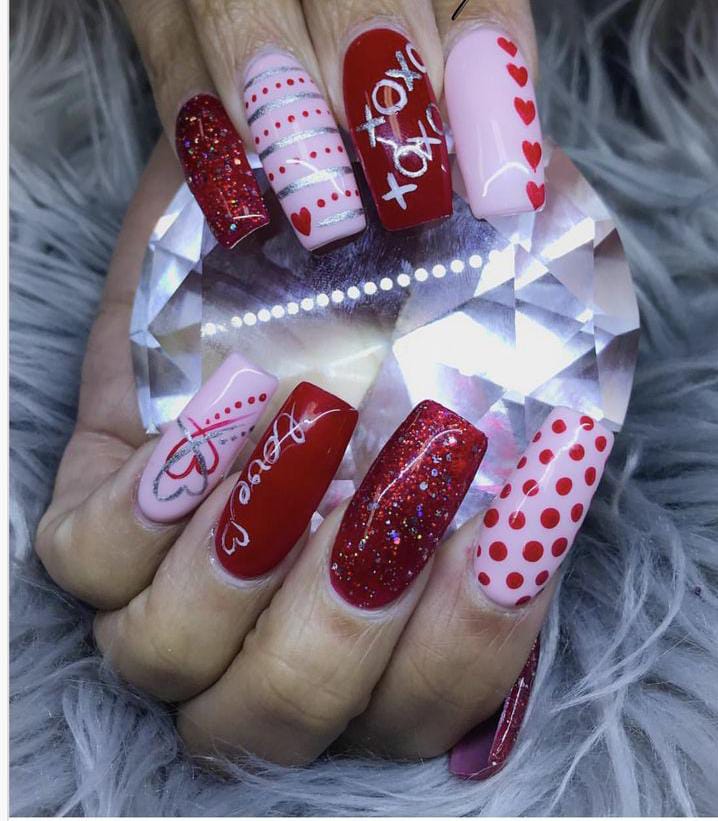 Dark red and blush pink nails combine glitter, dots, hearts, and cute Valentine text. The vibe is cheerful, festive, and full of personality.