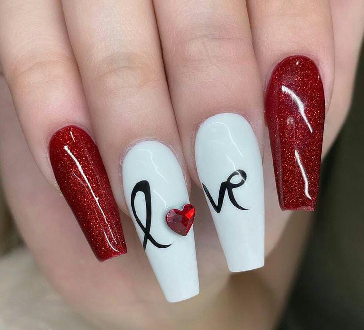 Glossy dark red glitter nails pair with clean white accents featuring a simple “love” script and a tiny heart gem. The look is elegant, romantic, and softly glamorous Valentine’s vibe.