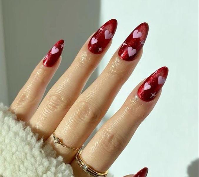 A rich dark red shimmer base is decorated with soft pink hearts scattered across the nails. The vibe is dreamy, feminine, and subtly flirty Valentines.