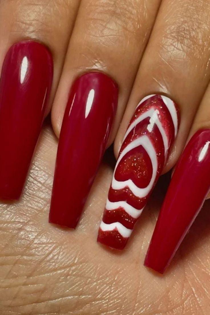 Deep red glossy nails stand out with a single accent nail featuring white heart waves over a shimmering red base. The style is romantic Valentines with a touch of sophistication.