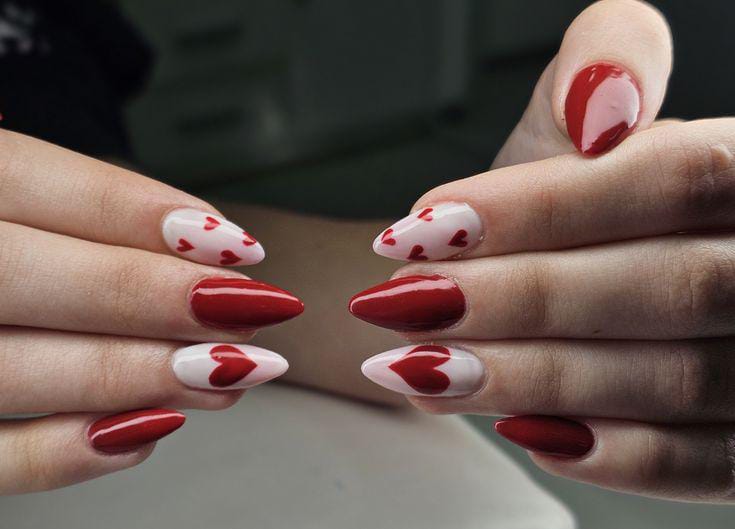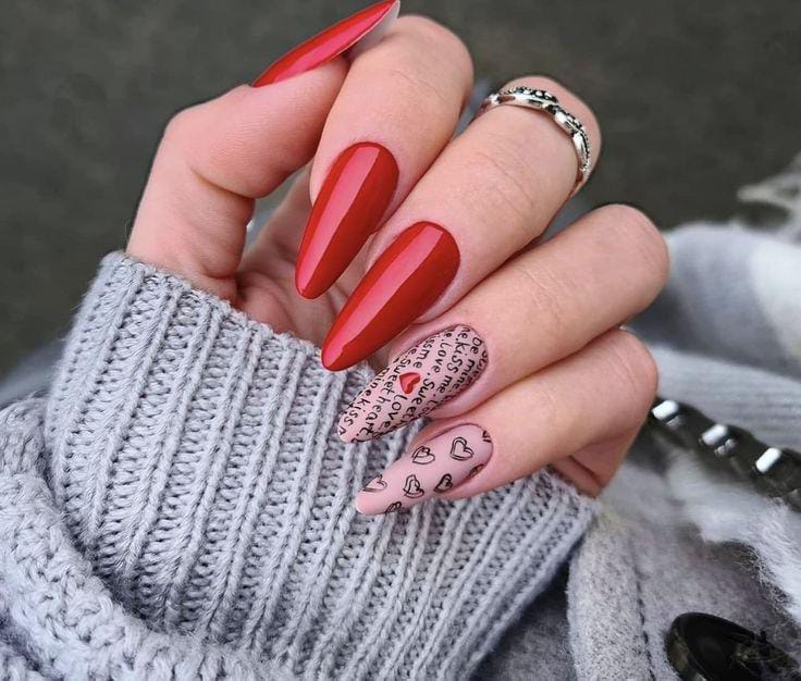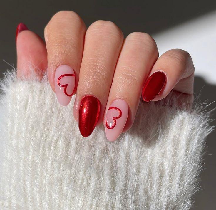 Rich red nails are paired with creamy nude accents decorated with tiny red hearts. The overall vibe is soft, romantic, and very Valentine-inspired.