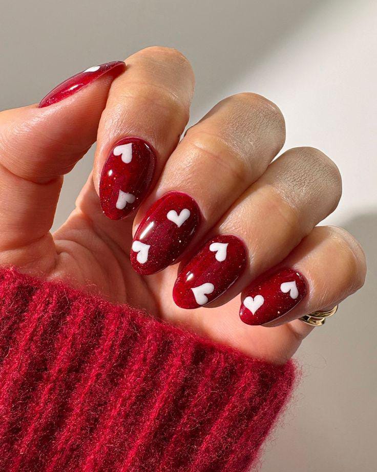 A rich dark red shimmer base is topped with small white heart patterns across each nail. It has a playful Valentine vibe while still looking clean and polished.