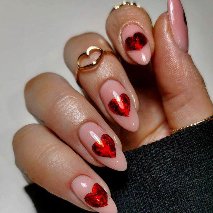 This design mixes dark red polish with sparkly red accents and soft heart shapes flowing through the nails. It feels bold, dramatic, and perfect for a statement Valentine look.