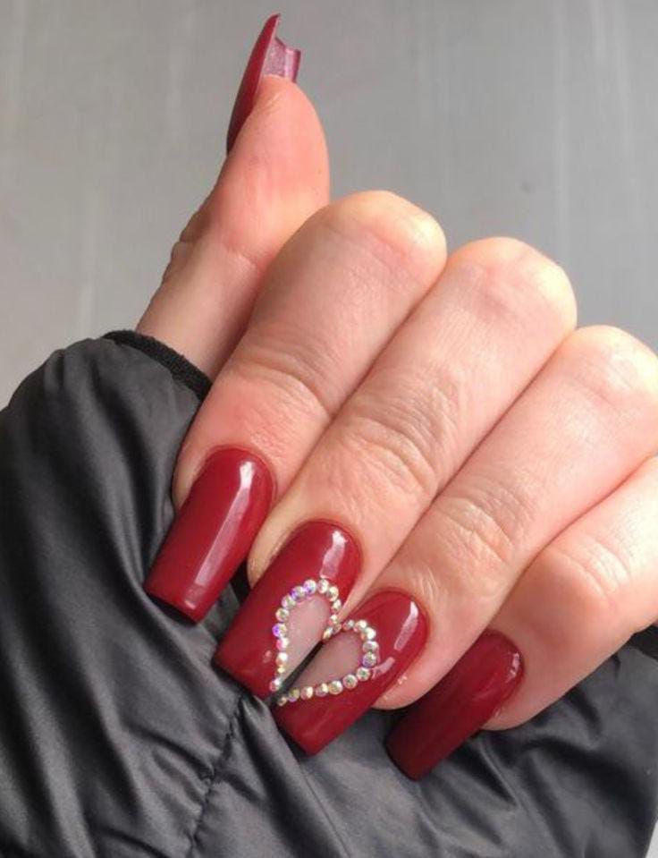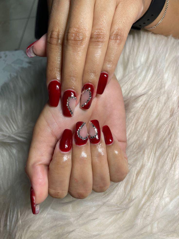 Rich dark red nails are paired with heart-shaped cutouts outlined in sparkling crystals. The style feels bold, glamorous, and perfect for a statement Valentine’s manicure.
