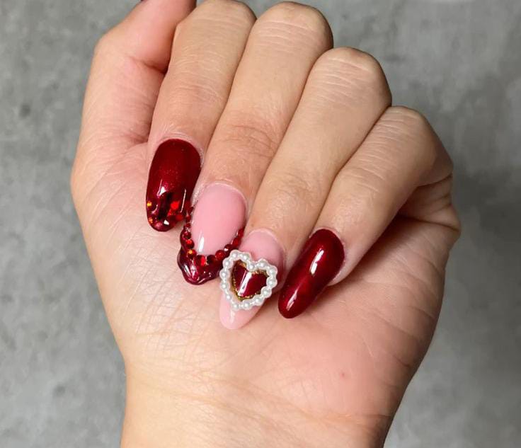 Dark red glitter nails are paired with nude accents featuring raised heart details and pearls outline. The look feels bold, romantic, and slightly luxurious valentines.