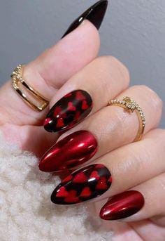 Rich cherry-red metallic nails are combined with black heart patterns for a dramatic Valentines finish. This look feels luxurious, confident, and evening-ready.