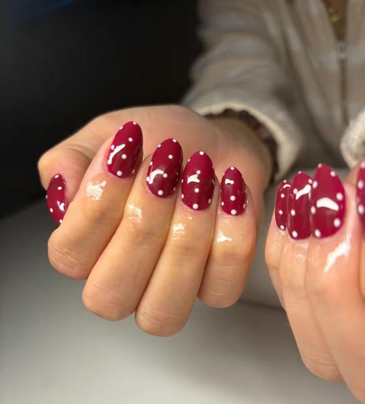 Rich dark red nails are decorated with tiny white polka dots for a playful Valentine twist. The design feels fun, cozy, and slightly retro.
