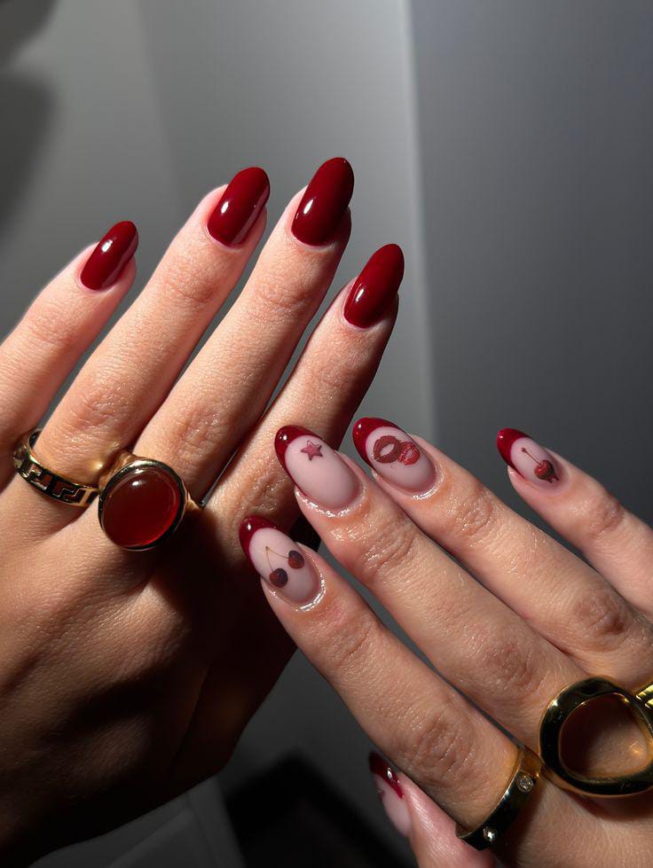 Dark red nails are balanced with creamy nude accents decorated with tiny cherry art. The overall vibe is cute, cozy, and subtly romantic Valentines.