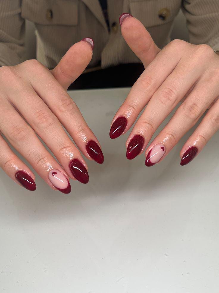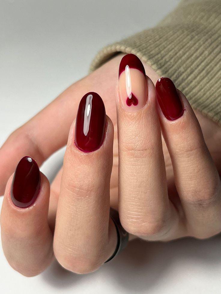 Glossy dark red nails are combined with a nude accent featuring a heart detail. The design feels bold, romantic, and effortlessly eye-catching Valentines.
