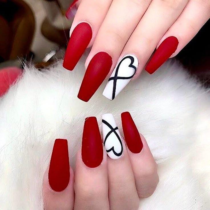 Dark red nails are balanced with clean white heart art and subtle black detailing. The style feels playful yet polished with a modern Valentines twist.