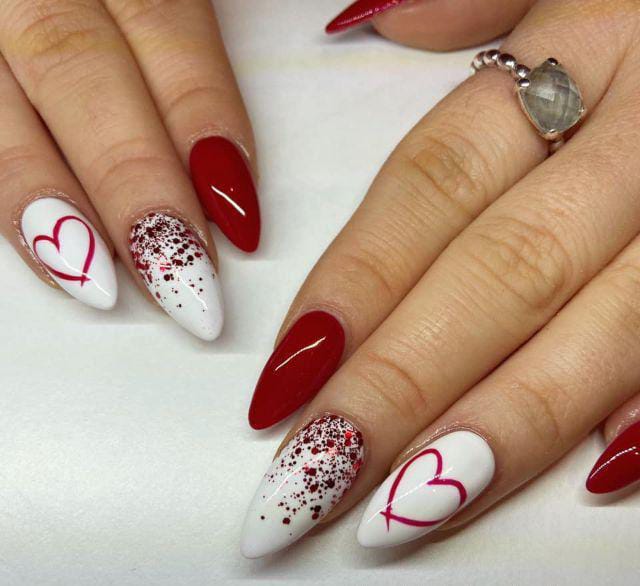 Glossy dark red nails are balanced with white accent nails featuring heart art and light red speckled details. The look is elegant, timeless, and perfect for a traditional Valentine aesthetic.