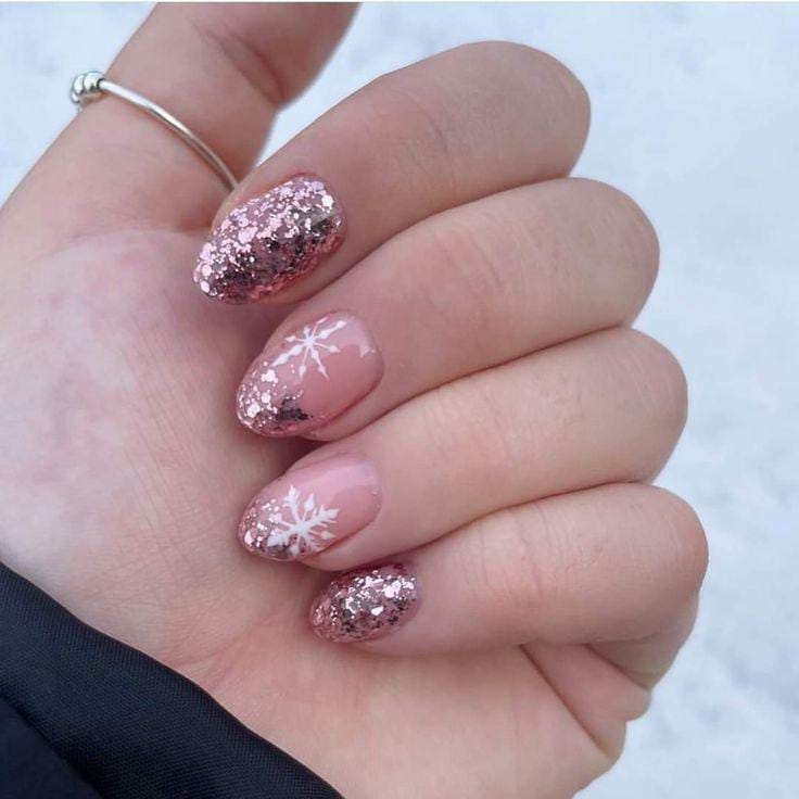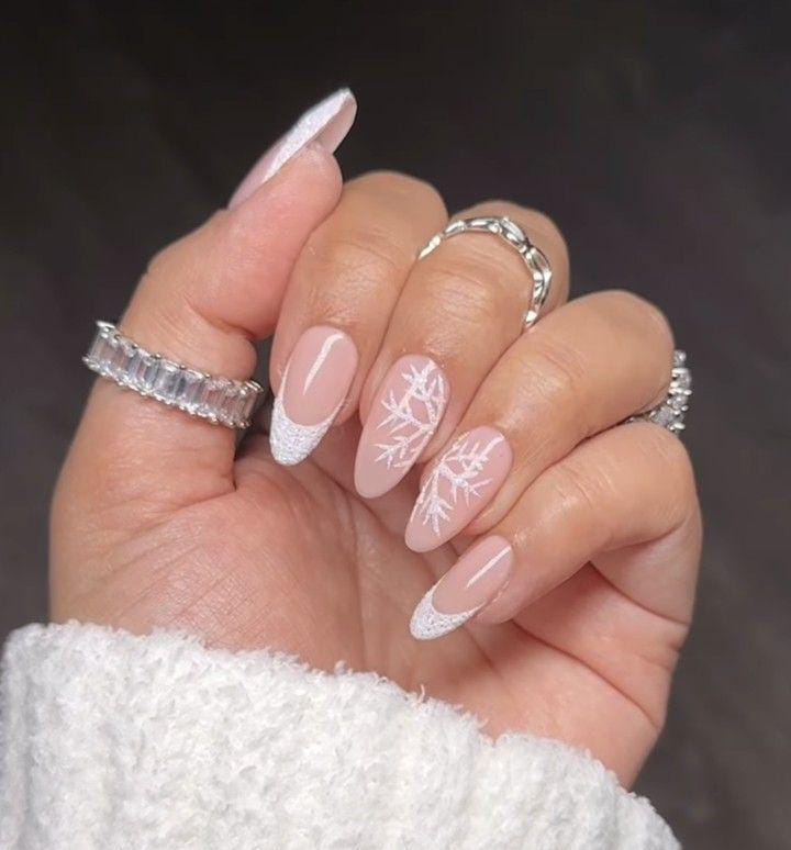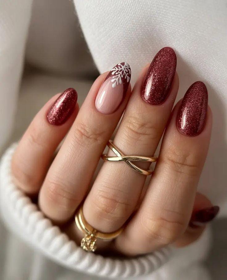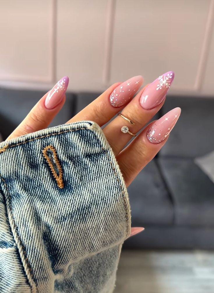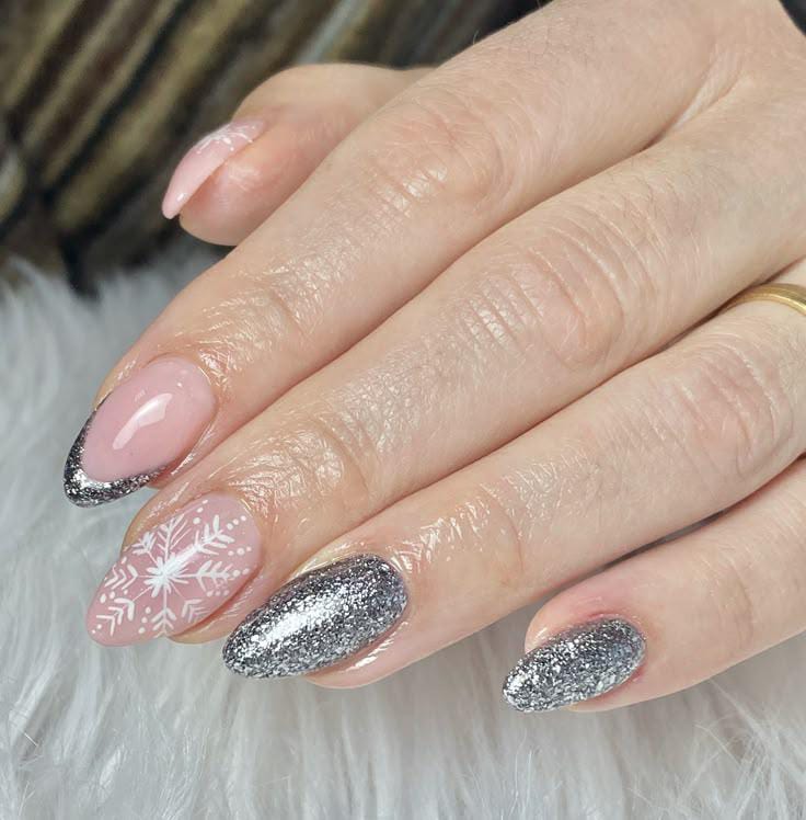 A blend of soft nude pink and bold silver glitter makes these almond nails both chic and wintery, while the white snowflake detail adds a crisp seasonal touch. The look balances subtle elegance with a hint of December sparkle.