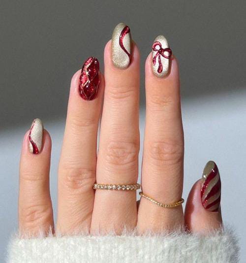 This design mixes gold shimmer with bold red accents, decorated with ribbon-like lines and a small bow that resemble wrapped holiday gifts. It’s a fun, glamorous look that adds a touch of luxury and celebration to December nails.