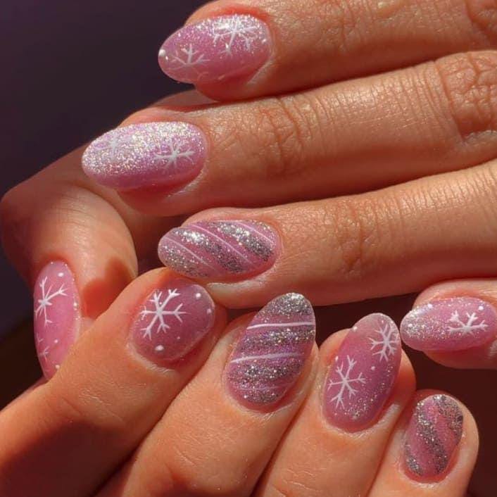 Soft pink nails with swirling silver glitter and delicate white snowflakes create a dreamy, frosty effect reminiscent of a gentle winter snowfall. The combination of sparkle and pastel tones gives the design a sweet, magical December feel.