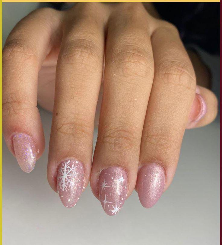 These soft pink almond nails have a gentle shimmer that gives them a frosty, delicate feel, while the white snowflakes and tiny star accents add a dreamy winter touch. The overall look is subtle, feminine, and perfect for a cozy December vibe.