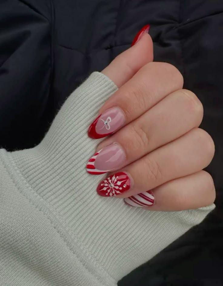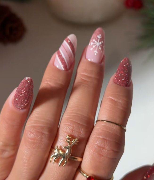 Blush-pink almond nails meet rose-red glitter accents, candy-stripe diagonal swirls, and a delicate white snowflake for a soft yet playful december holiday look.