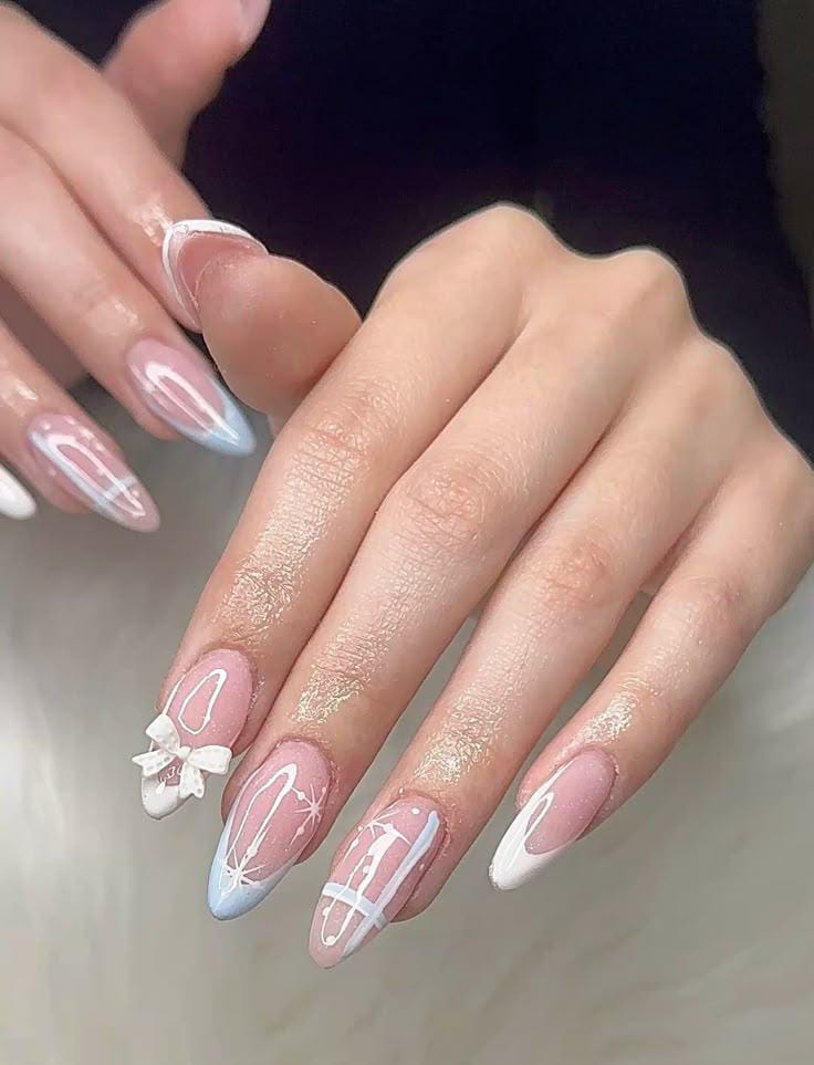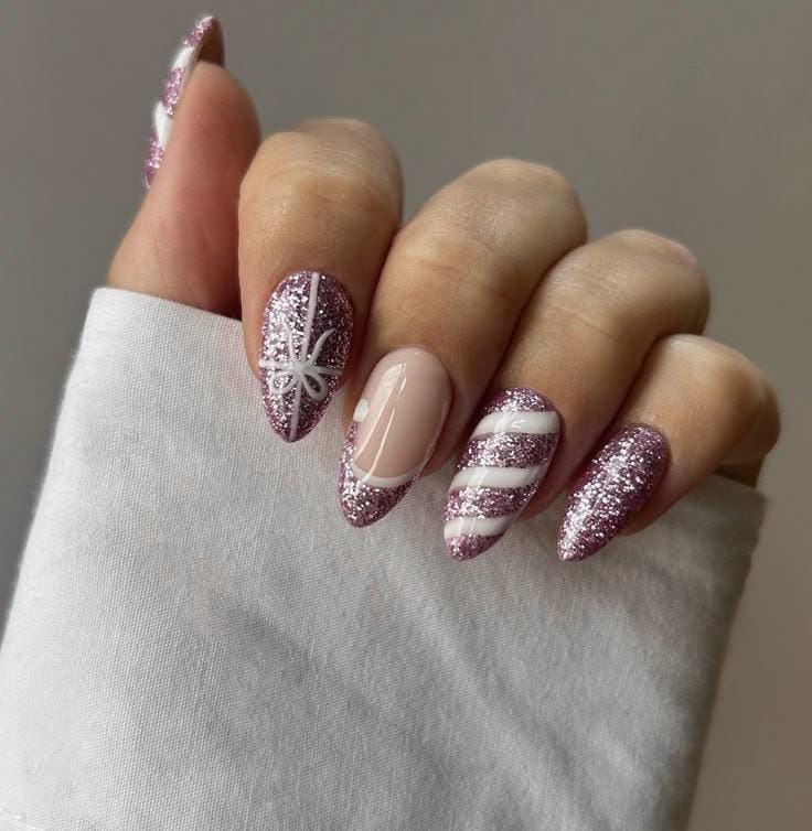 This design features almond-shaped nails covered in pink glitter accents, soft nude bases, and crisp white stripes and bow details, giving it a festive, wrapped-present vibe. It’s bright, fun, and perfect for a glam December look.