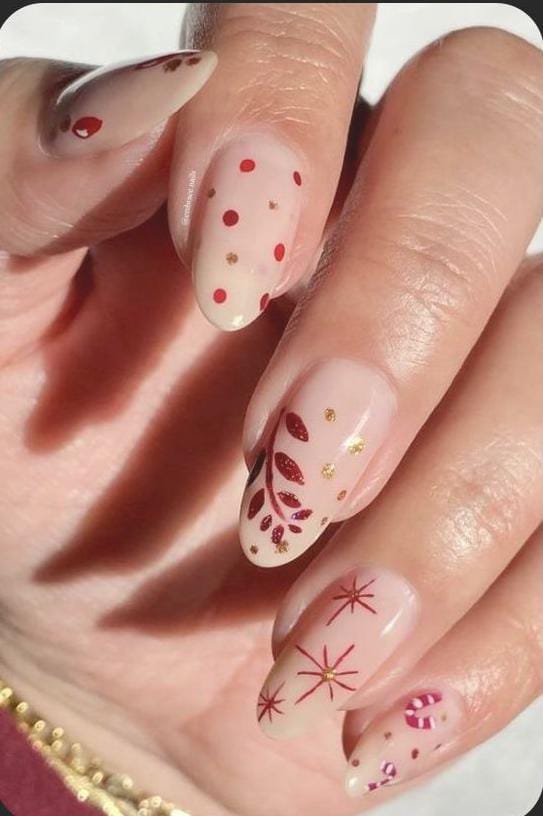 These nails use a warm nude base decorated with red and gold dots, leaf-like accents, and simple star shapes for a subtle, cozy December feel. It’s minimalist but still clearly seasonal and cheerful.