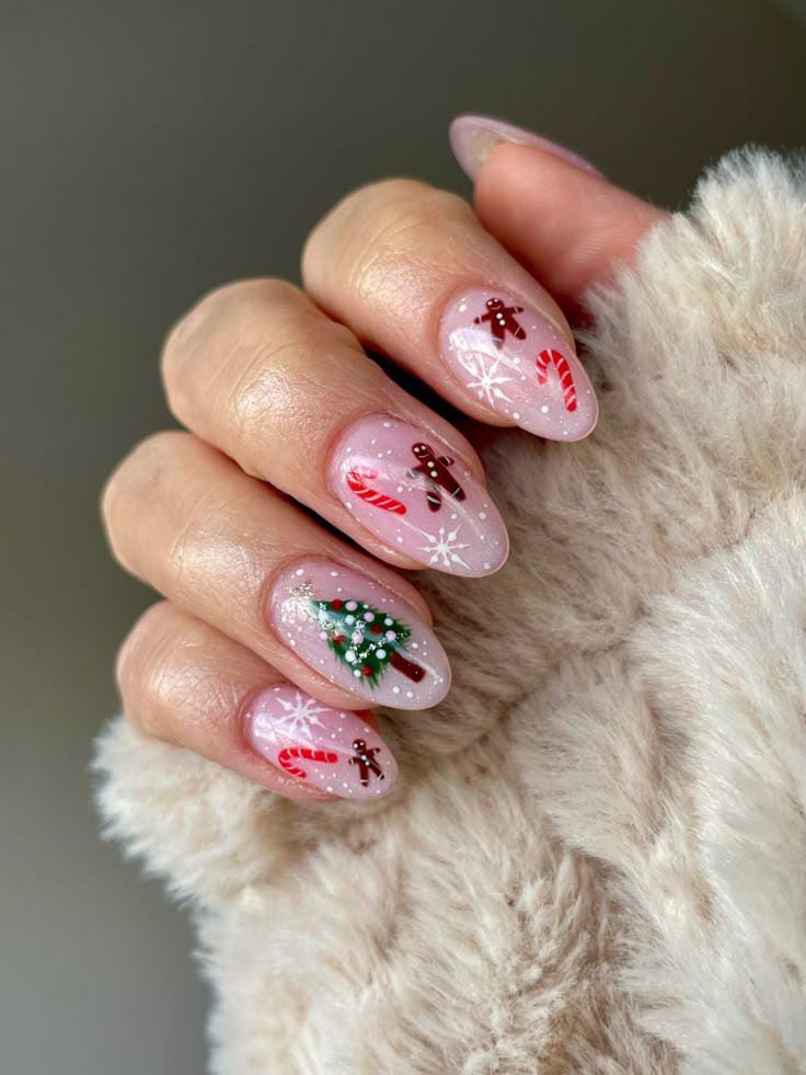 Soft pink, glossy bases are paired with tiny gingerbread men, candy canes, Christmas trees, and snowflake details for a playful December holiday aesthetic. The overall vibe is cute, whimsical, and full of festive charm.
