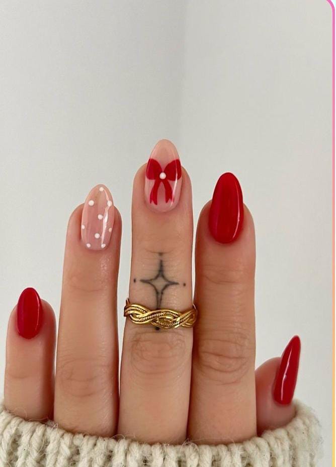 This design mixes bold red almond nails with soft nude bases decorated with white dots and a delicate red bow, creating a simple but festive December holiday feel.