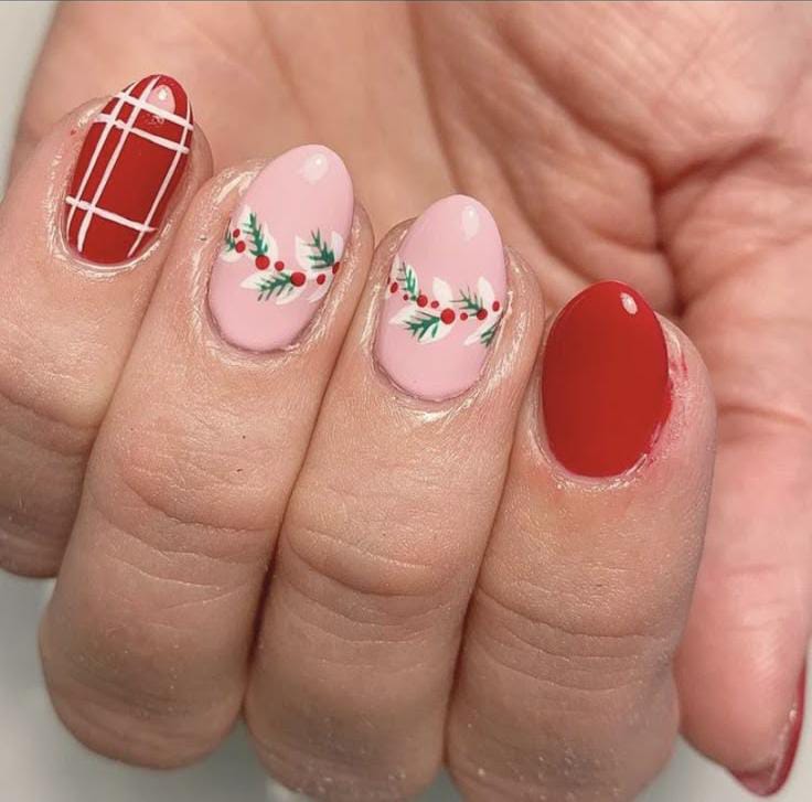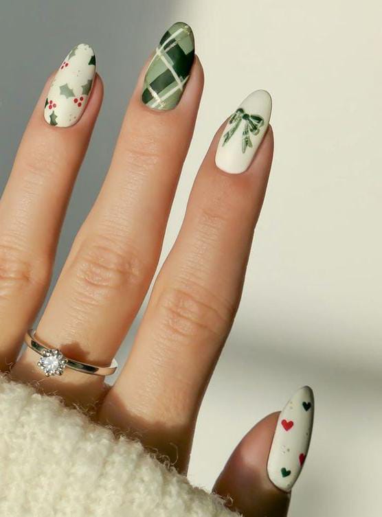 Soft cream nails are decorated with holly, mistletoe, hearts, and a deep green plaid, giving a warm, cozy, and slightly rustic December aesthetic.