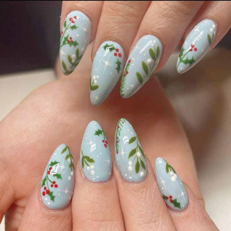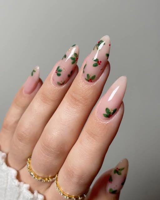 A sheer nude base decorated with tiny holly leaves and berries creates a delicate, classy December almond nail style. It feels soft, minimal, and beautifully seasonal.
